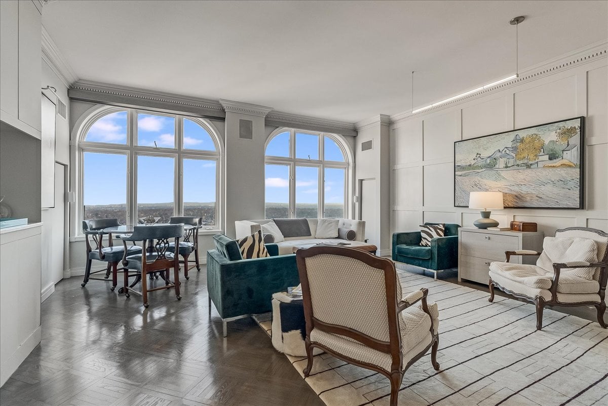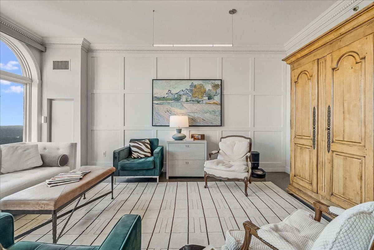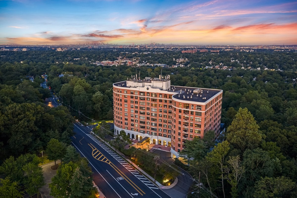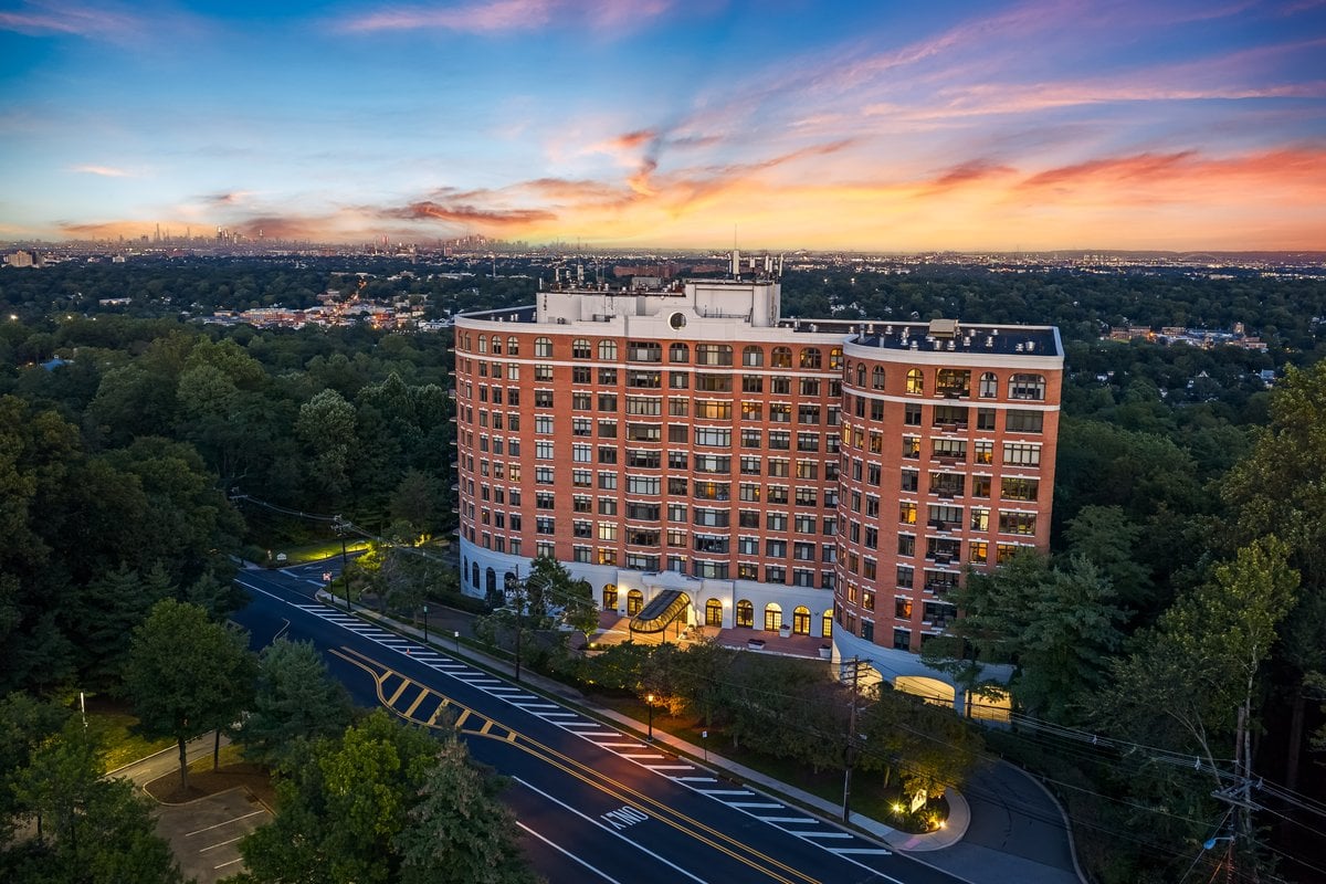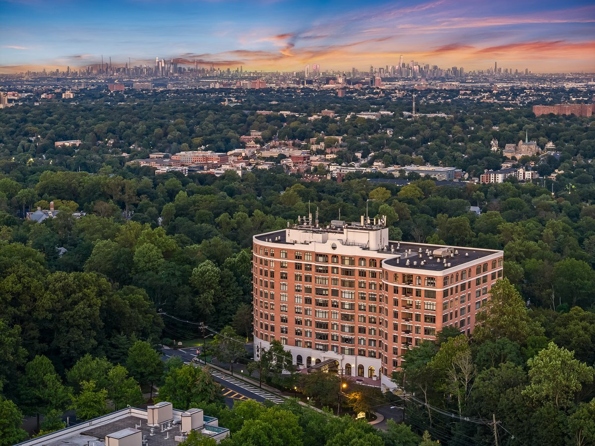 A million-dollar view of NYC and the tri-state region awaits in this luxury, maintenance-free residence at The Top. This stunning 1,038 sq. ft. home features 9.5-foot ceilings and windows with Palladian tops, offering incredible natural light. Enjoy breathtaking sunrises over the city and twinkling bridge lights — a truly magical experience. Enter through an elegant foyer with the view unfolding before you. The living and dining rooms feature floor-to-ceiling paneling and dentil moldings. The kitchen, with Wood-Mode cabinets, SubZero refrigerator, stainless steel appliances, granite floors, and marble tile backsplash, opens to the living/dining area for seamless entertaining. The paneled bedroom offers a retreat with a walk-in closet and an en suite marble bath with a jetted tub, stall shower, and Kohler fixtures. A paneled office with French doors and a built-in desk is ideal for working from home. parquet mahogany floors, solid mahogany doors, recessed lighting, and elegant sconces add sophistication. The space also includes a laundry, coat closet, utility closet, and marble powder room. Fabulous amenities include 24-hour security, concierge, valet parking, heated indoor pool, spa, fitness center, outdoor patio, library, and party room. Conveniently located near Maplewood and South Orange trains with direct NYC service, EWR Airport, SOPAC, Seton Hall, and more.