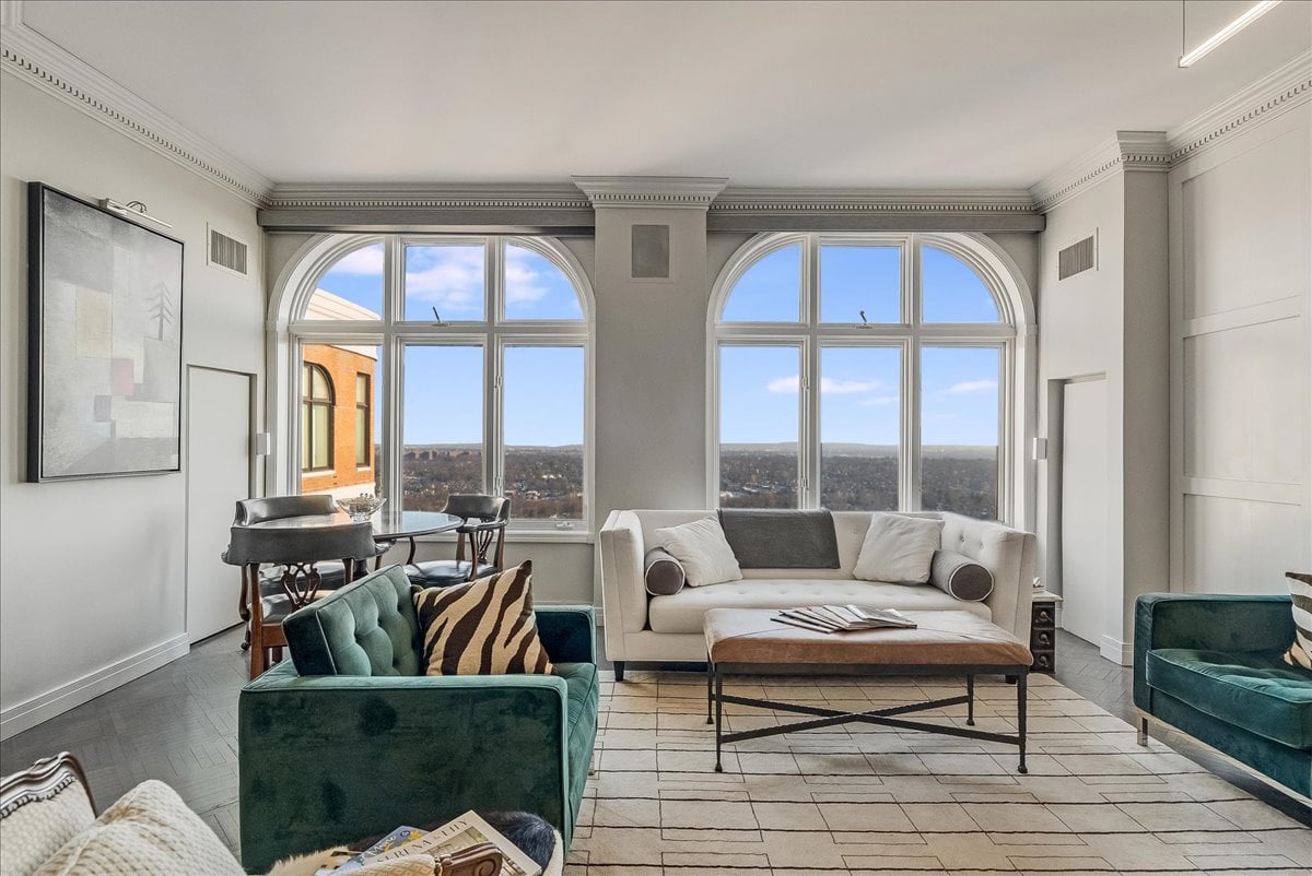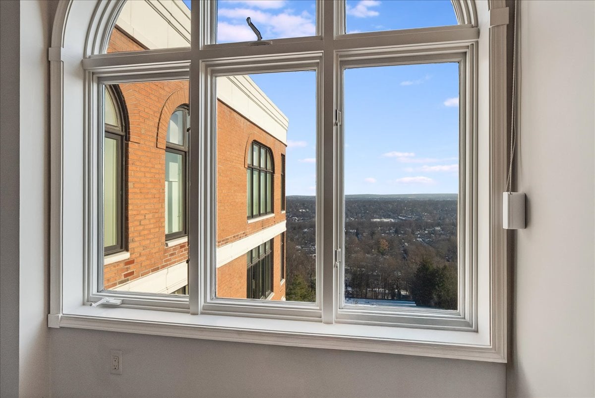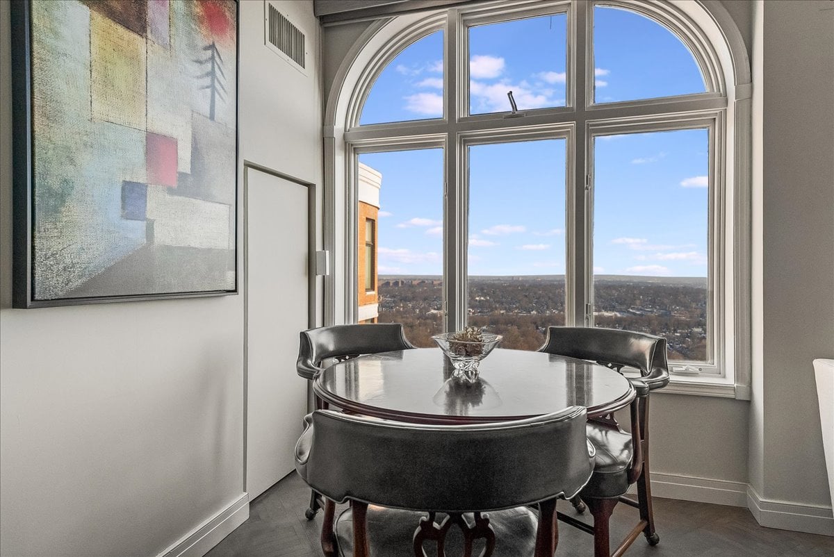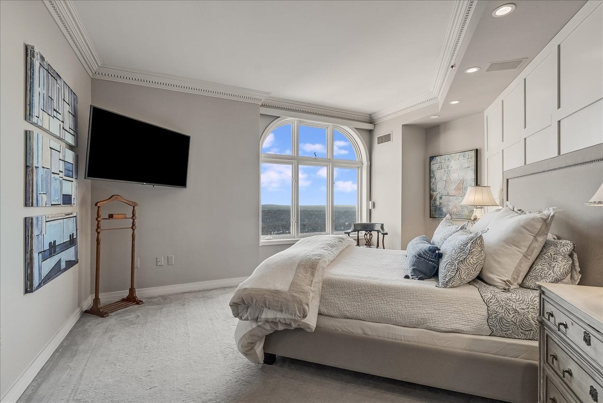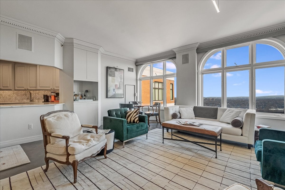 A million-dollar view of NYC and the tri-state region awaits in this luxury, maintenance-free residence at The Top. This stunning 1,038 sq. ft. home features 9.5-foot ceilings and windows with Palladian tops, offering incredible natural light. Enjoy breathtaking sunrises over the city and twinkling bridge lights — a truly magical experience. Enter through an elegant foyer with the view unfolding before you. The living and dining rooms feature floor-to-ceiling paneling and dentil moldings. The kitchen, with Wood-Mode cabinets, SubZero refrigerator, stainless steel appliances, granite floors, and marble tile backsplash, opens to the living/dining area for seamless entertaining. The paneled bedroom offers a retreat with a walk-in closet and an en suite marble bath with a jetted tub, stall shower, and Kohler fixtures. A paneled office with French doors and a built-in desk is ideal for working from home. parquet mahogany floors, solid mahogany doors, recessed lighting, and elegant sconces add sophistication. The space also includes a laundry, coat closet, utility closet, and marble powder room. Fabulous amenities include 24-hour security, concierge, valet parking, heated indoor pool, spa, fitness center, outdoor patio, library, and party room. Conveniently located near Maplewood and South Orange trains with direct NYC service, EWR Airport, SOPAC, Seton Hall, and more.