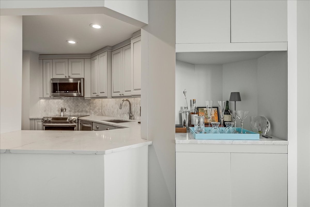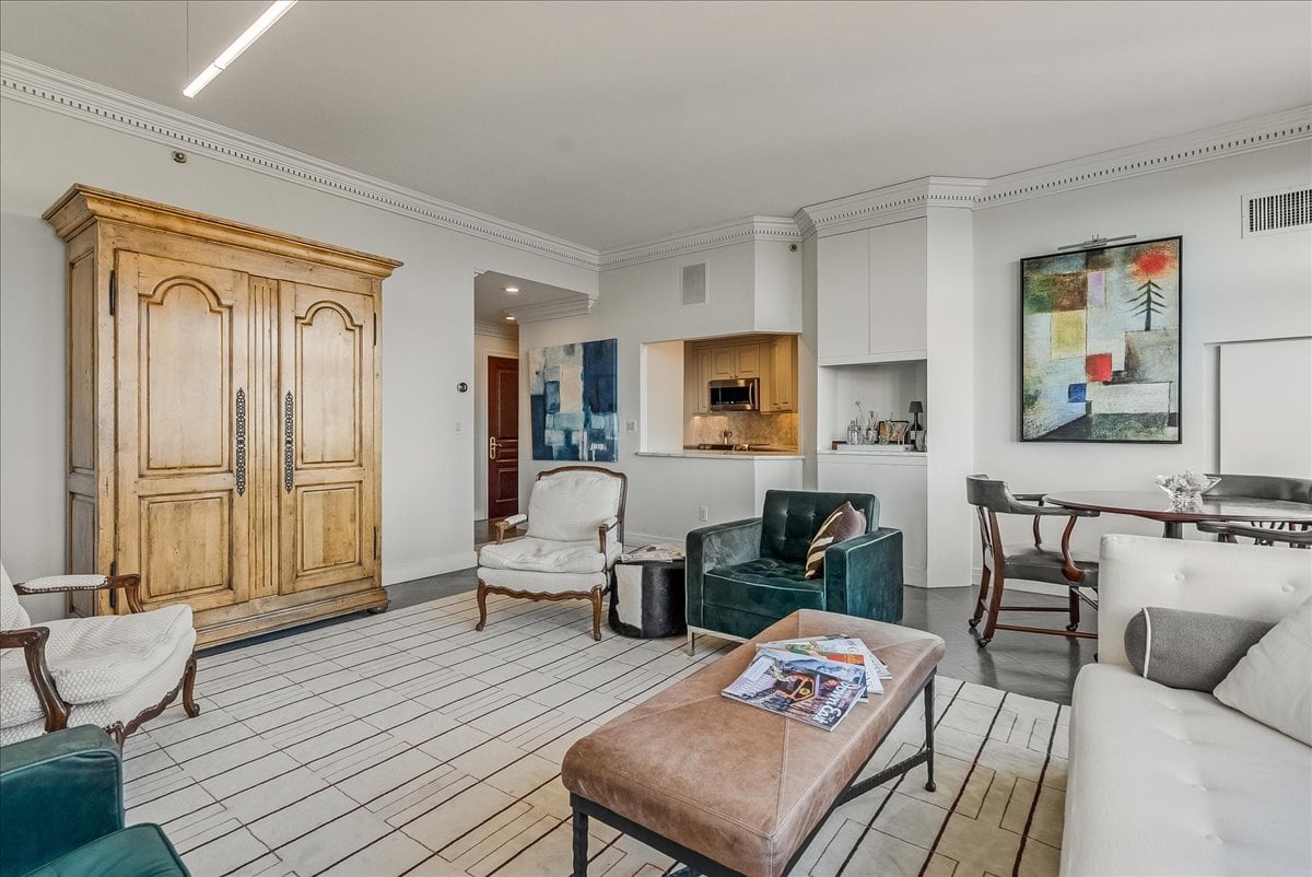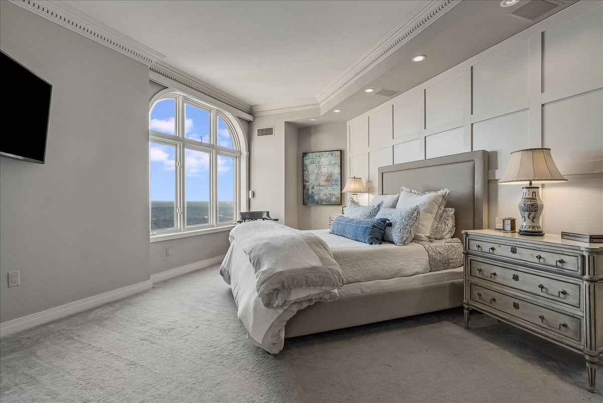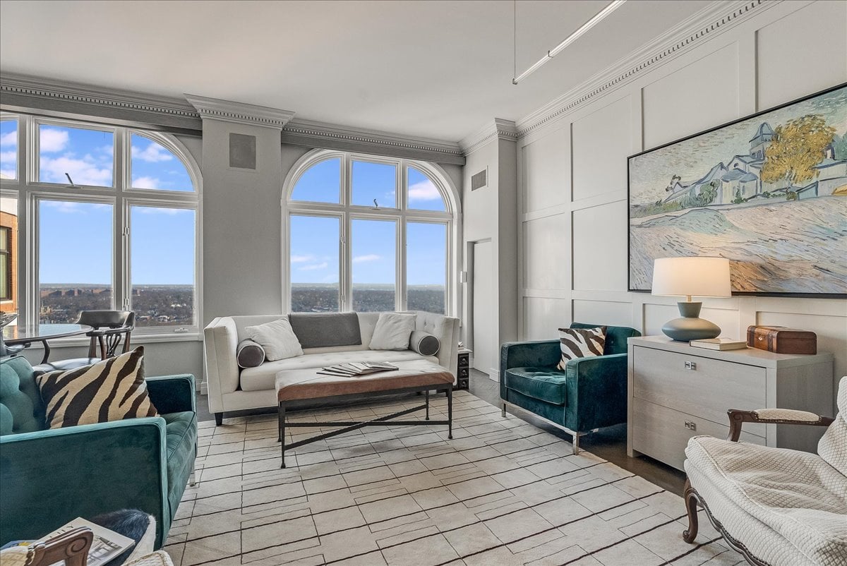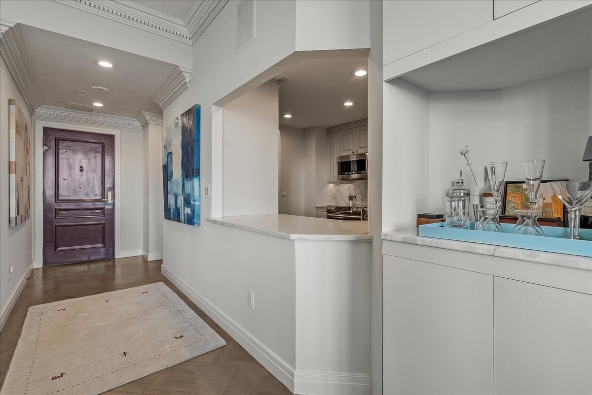 A million-dollar view of NYC and the tri-state region awaits in this luxury, maintenance-free residence at The Top. This stunning 1,038 sq. ft. home features 9.5-foot ceilings and windows with Palladian tops, offering incredible natural light. Enjoy breathtaking sunrises over the city and twinkling bridge lights — a truly magical experience. Enter through an elegant foyer with the view unfolding before you. The living and dining rooms feature floor-to-ceiling paneling and dentil moldings. The kitchen, with Wood-Mode cabinets, SubZero refrigerator, stainless steel appliances, granite floors, and marble tile backsplash, opens to the living/dining area for seamless entertaining. The paneled bedroom offers a retreat with a walk-in closet and an en suite marble bath with a jetted tub, stall shower, and Kohler fixtures. A paneled office with French doors and a built-in desk is ideal for working from home. parquet mahogany floors, solid mahogany doors, recessed lighting, and elegant sconces add sophistication. The space also includes a laundry, coat closet, utility closet, and marble powder room. Fabulous amenities include 24-hour security, concierge, valet parking, heated indoor pool, spa, fitness center, outdoor patio, library, and party room. Conveniently located near Maplewood and South Orange trains with direct NYC service, EWR Airport, SOPAC, Seton Hall, and more.