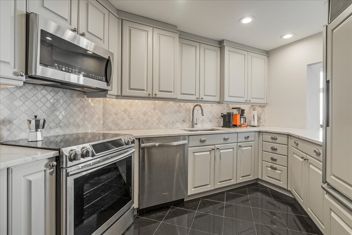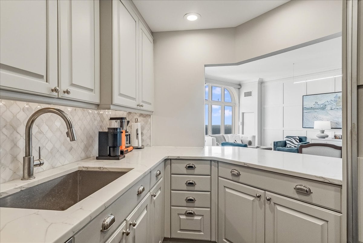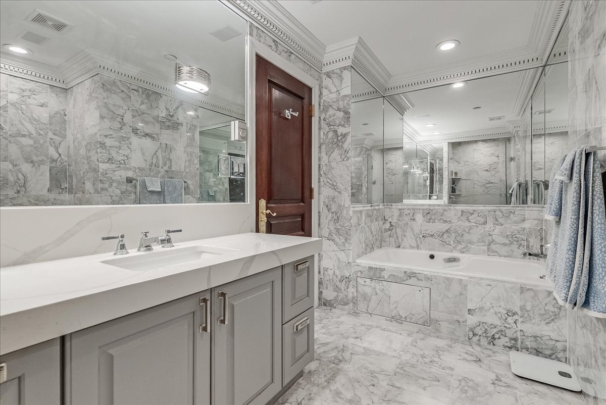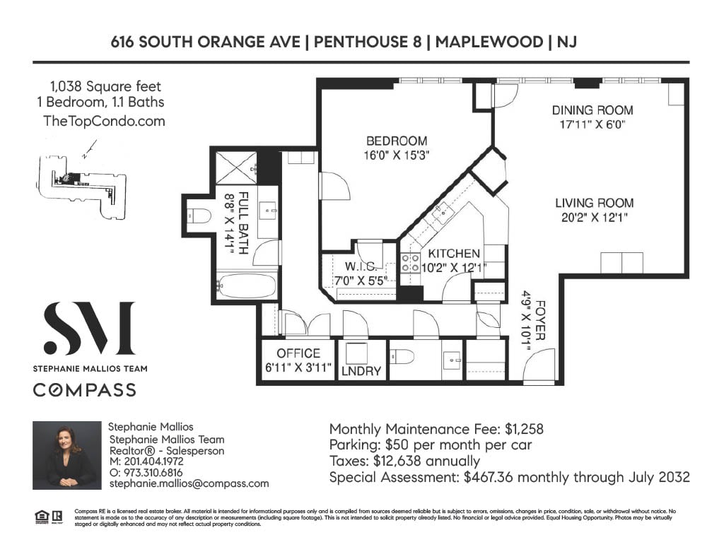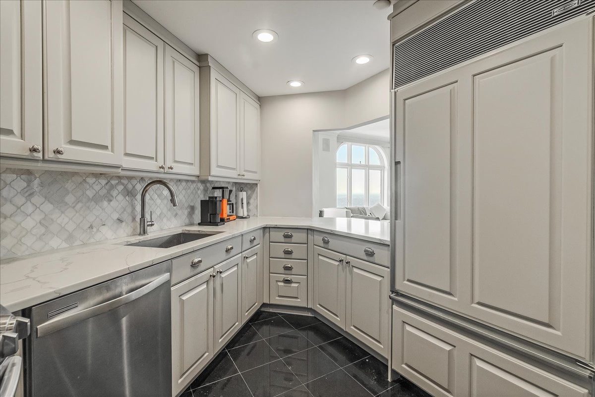 A million-dollar view of NYC and the tri-state region awaits in this luxury, maintenance-free residence at The Top. This stunning 1,038 sq. ft. home features 9.5-foot ceilings and windows with Palladian tops, offering incredible natural light. Enjoy breathtaking sunrises over the city and twinkling bridge lights — a truly magical experience. Enter through an elegant foyer with the view unfolding before you. The living and dining rooms feature floor-to-ceiling paneling and dentil moldings. The kitchen, with Wood-Mode cabinets, SubZero refrigerator, stainless steel appliances, granite floors, and marble tile backsplash, opens to the living/dining area for seamless entertaining. The paneled bedroom offers a retreat with a walk-in closet and an en suite marble bath with a jetted tub, stall shower, and Kohler fixtures. A paneled office with French doors and a built-in desk is ideal for working from home. parquet mahogany floors, solid mahogany doors, recessed lighting, and elegant sconces add sophistication. The space also includes a laundry, coat closet, utility closet, and marble powder room. Fabulous amenities include 24-hour security, concierge, valet parking, heated indoor pool, spa, fitness center, outdoor patio, library, and party room. Conveniently located near Maplewood and South Orange trains with direct NYC service, EWR Airport, SOPAC, Seton Hall, and more.